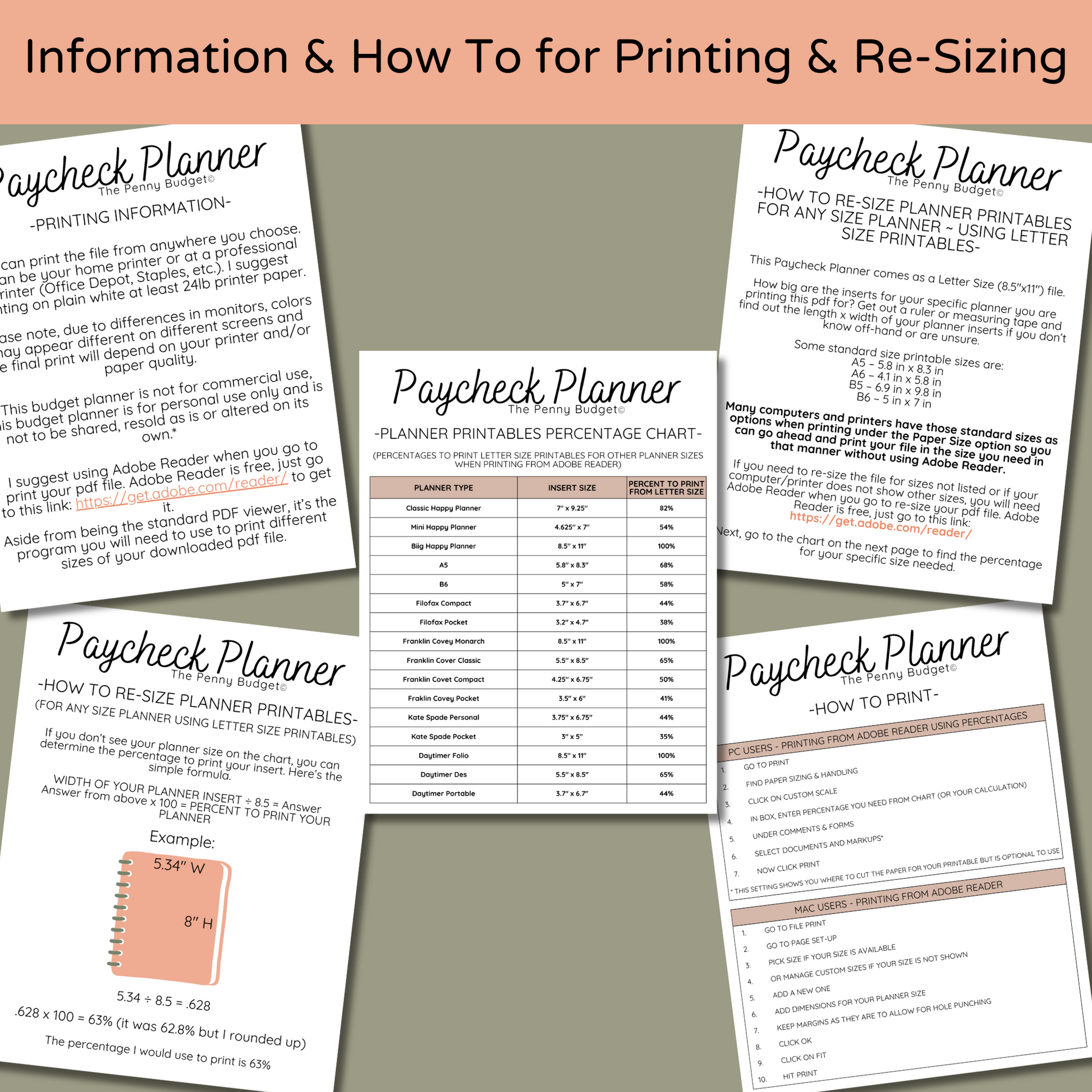 This listing is for a printable 6 month, undated, single-side pages Paycheck Planner. It will be available immediately after your purchase to download as an 8.5"x11" PDF. The Paycheck Planner is 96 pages in length with an additional 6 pages of instructions on printing and re-sizing the file. The files are high resolution and can be re-sized to fit the size planner holder you have.